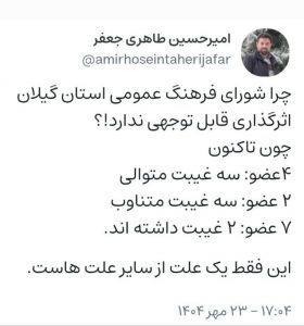 به گزارش پایگاه خبری تحلیلی آوای لطیف :اظهارات امیرحسین طاهری جعفر، مدیرکل ارشاد استان گیلان، در شبکه اجتماعی خود پرده از یک چالش ساختاری مهم در شورای فرهنگ عمومی این استان برمیدارد. وی با اشاره مستقیم به آمار بالای غیبت اعضا، این مسئله را به عنوان یک علت کلیدی برای «اثرگذاری قابل توجه نداشتن» این شورا معرفی میکند. این بیان، نقطه آغازینی برای تحلیل عمیقتر دلایل احتمالی این ضعف است.