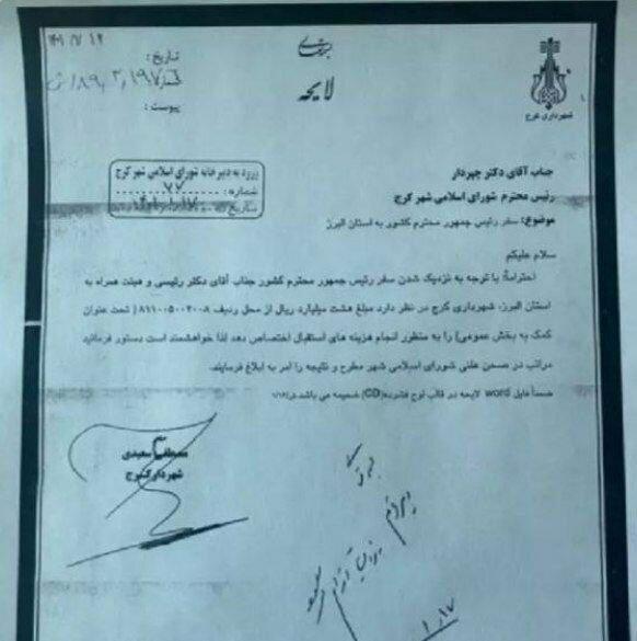 به گزارش پایگاه خبری تحلیلی آوای لطیف :ظهر پنجشنبه نامهای منتشر شد که نشان میداد شهرداری کرج هشتصد میلیون تومان برای از بودجه عمومی برای استقبال از رئیس جمهور هزینه کرده است.